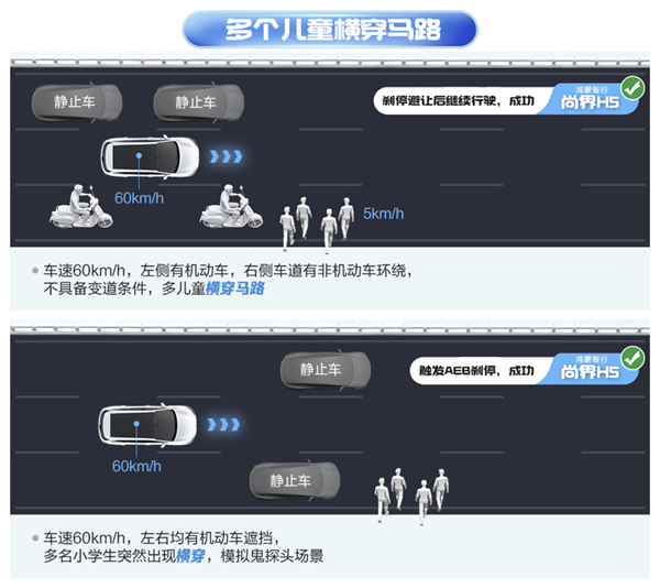 尚界H5在此次測(cè)試中,在多個(gè)項(xiàng)目中均表現(xiàn)出穩(wěn)定的識(shí)別與決策能力。在部分測(cè)試中,系統(tǒng)判斷僅依靠制動(dòng)無(wú)法完全避免碰撞時(shí),啟用了eAES增強(qiáng)型自動(dòng)緊急轉(zhuǎn)向輔助功能,完成規(guī)避動(dòng)作。在兒童橫穿等復(fù)雜場(chǎng)景中,系統(tǒng)亦能實(shí)現(xiàn)及時(shí)識(shí)別與剎停。