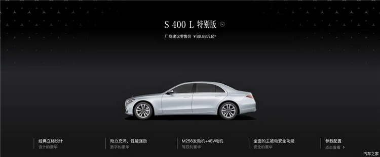 具體來看,此次新增的S 400 L特別版相比S 400 L商務型,減少后排智能空調、霧霾終結者3.0等配置,取消車內空氣調節組件、主動式環境氛圍燈、智能感應助理、后排用于移動設備的無線充電功能、自適應后排照明系統、MBUX后排智能平板電腦等選裝項。