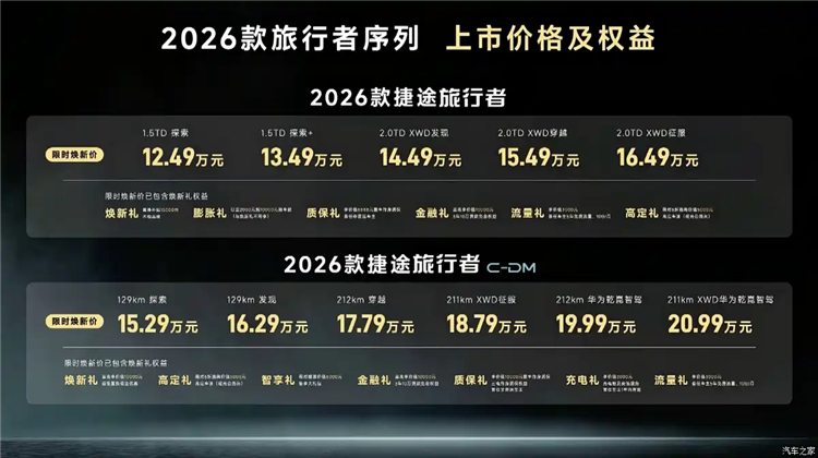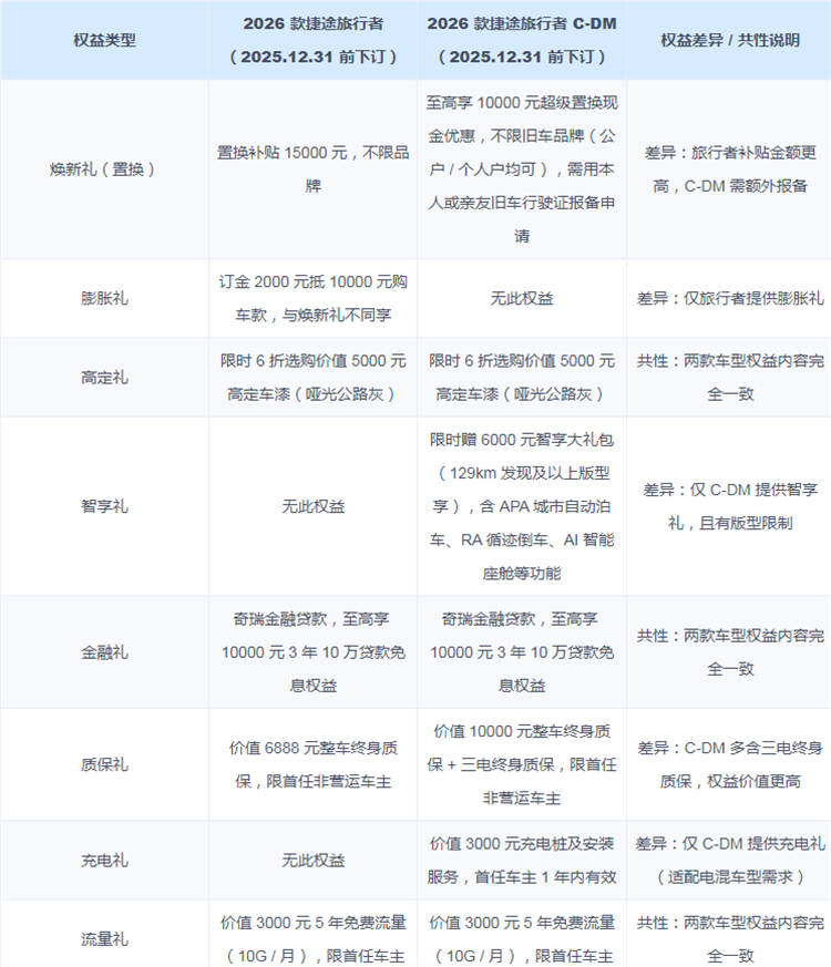 2026款捷途旅行者C-DM上市權(quán)益,在2025年12月31日前下訂用戶可享:1、煥新禮:至高享價(jià)值 10000 元超級(jí)置換現(xiàn)金優(yōu)惠,不限舊車(chē)品牌,公戶 / 個(gè)人戶均可,需使用本人或親友舊車(chē)行駛證報(bào)備申請(qǐng)。2、高定禮:限時(shí) 6 折選購(gòu)價(jià)值 5000 元高定車(chē)漆(啞光公路灰)。3、智享禮:限時(shí)贈(zèng)送價(jià)值 6000 元智享大禮包,129km 發(fā)現(xiàn)及以上版型可享,含 APA 城市自動(dòng)泊車(chē)系統(tǒng)、RA 循跡倒車(chē)系統(tǒng)、AI 智能座艙系統(tǒng)、主駕 8 點(diǎn)立體按摩功能及女王副駕座椅。4、金融禮:通過(guò)奇瑞金融貸款,至高享價(jià)值 10000 元 3 年 10 萬(wàn)貸款免息權(quán)益。5、質(zhì)保禮:價(jià)值 10000 元整車(chē)終身質(zhì)保 + 三電終身質(zhì)保權(quán)益,限首任非營(yíng)運(yùn)車(chē)主。6、充電禮:價(jià)值 3000 元充電樁及安裝服務(wù),首任車(chē)主 1 年內(nèi)有效。7、流量禮:價(jià)值 3000 元 5 年免費(fèi)流量,每月 10G,限首任車(chē)主。