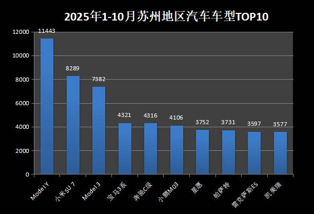 2025年1-10月,Model Y、小米SU 7、Model 3、寶馬3系、奔馳C級、小鵬M03、星愿、帕薩特、雷克薩斯ES、凱美瑞,分別以11443輛、8289輛、7382輛、4321輛、4316輛、4106輛、3752輛、3731輛、3597輛、3577輛,位居車型銷量前十。