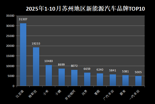 2025年1-10月,比亞迪、特斯拉、小米、小鵬 、吉利銀河、問界、零跑、廣汽豐田、蔚來、一汽豐田,分別以31307輛、19233輛、10483輛、8699輛、8072輛、6659輛、6240輛、5841輛、5381輛、5005輛,位居新能源汽車品牌銷量前十。