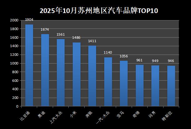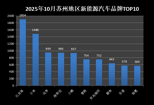 2025年10月,比亞迪、小米、問界、特斯拉、小鵬、零跑、吉利銀河、蔚來、樂道、極氪,分別以1904輛、1486輛、949輛、946輛、937輛、754輛、752輛、643輛、579輛、569輛,位居新能源汽車品牌銷量前十。