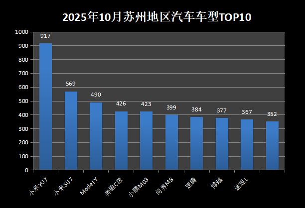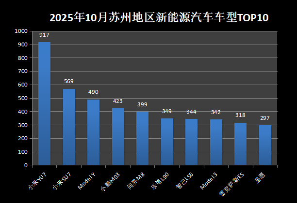 2025年10月,小米YU7、小米SU7、Model Y、小鵬M03、問界M8、樂道L90、智己LS6、Model 3、雷克薩斯ES、星愿,分別以917輛、569輛、490輛、423輛、399輛、349輛、344輛、342輛、318輛、297輛,位居新能源汽車車型銷量前十。