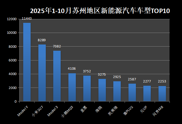 2025年1-10月,Model Y、小米SU7、Model 3、小鵬M03、星愿、海鷗、凱美瑞、秦PLUS、元UP、問界M8,分別以11443輛、8289輛、7382輛、4106輛、3752輛、3275輛、2925輛、2587輛、2277輛、2253輛,位居新能源汽車車型銷量前十。