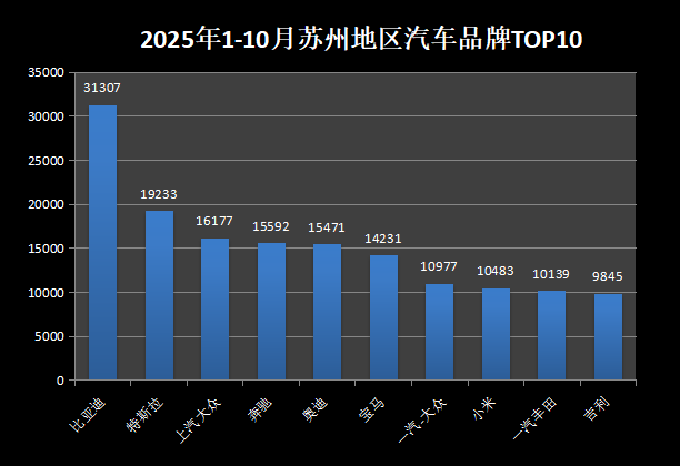 2025年1-10月,比亞迪、特斯拉、上汽大眾、奔馳、奧迪、寶馬、一汽-大眾、小米、一汽豐田、吉利,分別以31307輛、19233輛、16177輛、15592輛、15471輛、14231輛、10977輛、10483輛、10139輛、9845輛,位居品牌銷量前十。