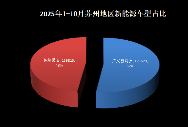 2025年1-10月,傳統燃油汽車銷量158815輛,廣義新能源汽車銷量173623輛,廣義新能源汽車市占率52%。