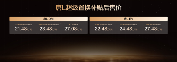 此次,唐L EV 3款車型,補貼后售價22.48萬~27.48萬元;唐L DM 3款車型,補貼后售價21.48萬~27.08萬元;同時,比亞迪還為用戶準備了包含置換補貼在內的至高價值4.5萬元尊享禮遇,讓旗艦體驗觸手可及。